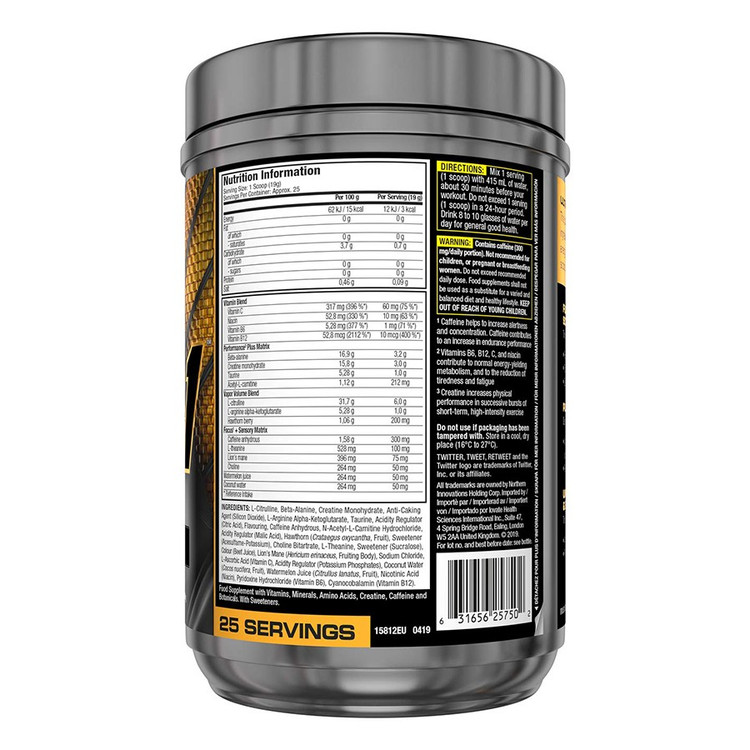- هر وعده ( 1 پیمانه / 19 گرم ) حاوی 3 کیلو کالری انرژی ، 0.7 گرم کربوهیدرات ، ترکیبات ویتامین ( 60 میلی گرم ویتامین C و 10 میلی گرم نیاسین ، 1 میلی گرم ویتامین B6 و 10 میکرو گرم ویتامین B12 ) ، ماتریس عملکردی ( 3.2 گرم بتا آلانین ، 3 گرم کراتین منوهیدرات ، 1 گرم تائورین و 212 میلی گرم استیل ال کارنیتین ) ، ترکیبات ویپر ( 6 گرم ال سیترولین ، 1 گرم آرژنین AKG و 200 میلی گرم زالزالک ) و ماتریس هوشیاری و تمرکز ( 300 میلی گرم کافئین بی آب ، 100 میلی گرم تیانین ، 75 میلی گرم Lion's Mane ( نوعی قارچ ) ، 50 میلی گرم کولین ، 50 میلی گرم آب هندوانه و 50 میلی گرم آب نارگیل )