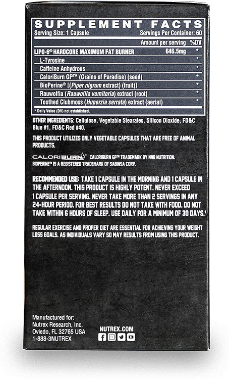 ❼ هر وعده ( 1 کپسول ) حاوی 646.5 میلی گرم ترکیبات Lipo-6 Hardcore