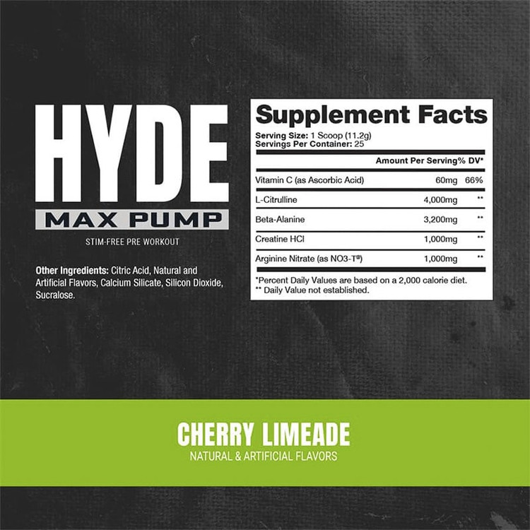 پمپ هاید مکس همچنین حاوی 3200 میلیگرم بتا آلانین برای کمک به عبور از نقطه خستگی برای تکرار بیشتر و کراتین HCl برای افزایش حجم عضلات است. بدون گلوتن است و قند، کربوهیدرات و کالری ندارد.