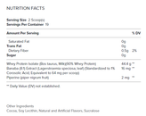 ❸ هر وعده ( 2 پیمانه / 47 گرم ) حاوی 170 کالری ، 40 گرم پروتئین ، 2.5 گرم کربوهیدرات ، 1 گرم چربی ، 1 میلی گرم کلسترول ، 63 میلی گرم سدیم ، 2 میلی گرم پیپرین
