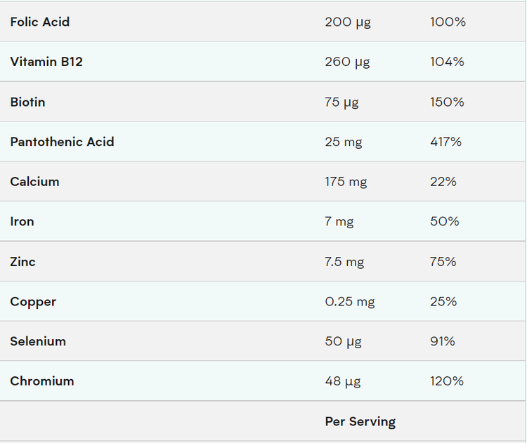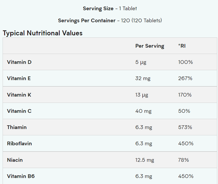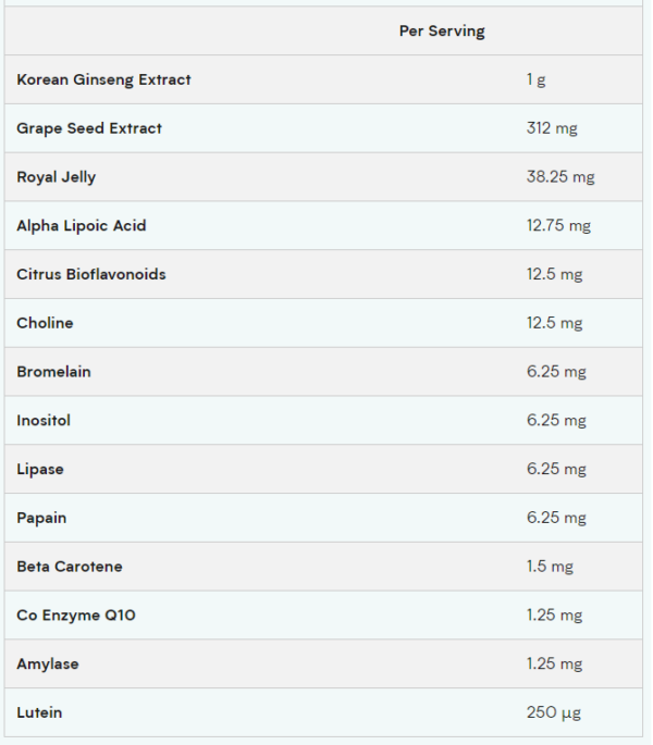 کربنات کلسیم ، عامل حجم دهنده (میکرو کریستالی سلولز) ، ویتامین C ، پودر ویتامین E طبیعی ، عصاره Panax Ginseng 10: 1 (Panax ginseng) ، اسید پانتوتنیک ، کلرید بیتارتات ، فومارات آهنی ، کلرید پتاسیم ، اکسید منیزیم ، ریبوفلاوین ، عصاره ژل رویال 3 : 1 ، مجتمع بیوفلاونوئید آلفا لیپوئیک اسید سیرتوس ، عوامل ضد پخت (استرات منیزیم ، دی اکسید سیلیکون) ، مواد لعاب دهنده (هیدروکسی پروپیل متیل سلولز ، گلیسیرین ، موم کارنوابا) ، اکسید روی ، ویتامین B6 ، تیامین ، بتا کاروتین ، 20٪ ، ٪ ، لیپاز ، عصاره بروملیان (Ananas comosus L.) ، پودر پاپائین ، سدیم سلنیت ، ویتامین D2 ، عصاره دانه انگور (Vitis vinifera) ، Co Enzyme Q10 ، آمیلاز ، سولفات مس ، لوتئین (Tagetes erecta L.) ، کروم پیکولینات ، ویتامین B12 ، ویتامین K1 ، اسید فولیک ، بیوتین.
