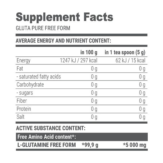 خوب است بدانید که پیورگلوتامین حاوی فرم آزاد گلوتامین و بنابراین زودجذب است. هر وعده از این گلوتاپیور حاوی 5000 میلی گرم آمینواسید ال گلوتایمن است.