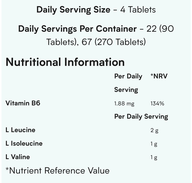 ❼ هر وعده حاوی 1.88 میلی گرم ویتامین B6 و 4 گرم BCAA به نسبت 1 : 1 : 2 ( 2 گرم لوسین ، 1 گرم ایزولوسین و 1 گرم والین )