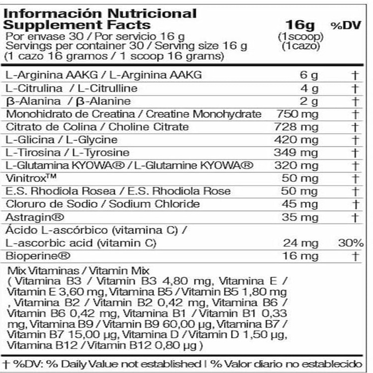 ال-آرژینین آلفا کتو گلوتارات، ال سیترولین مالات، بتا آلانین، کراتین مونوهیدرات، کولین سیترات، اسیدی (اسید سیتریک)، طعم طبیعی، ال-تیروزین، ال-گلوتامین کیفیت Kyowa، گلیسینام ضد انسداد (دی اکسید سیلیکون)، پودر کنسانتره چغندر (بتا bulgaris L.)، طعم دهنده ها، مخلوط ویتامین (ویتامین b3، ویتامین E، ویتامین B5، ویتامین B2، ویتامین B6، ویتامین B1، ویتامین B9، ویتامین B7، ویتامین D، ویتامین B12)، عصاره خشک رودیولا ریشه گل رز (sedum roseum L.)، عصاره تفاله انگور (vitis vinifera) و عصاره پوست سیب (malus pumila) (Vinitrox)، کلرید سدیم، AstraGin (Astragalus membranaceus و panax notoginseng)، شیرین کننده (سوکرالوز)، عصاره فلفل سیاه BioPerine ( Piper nigrum) (میوه) (98% پیپرین).