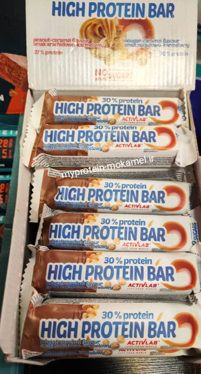 High Protein Bar یک شکلات شیری با بالا و بدون شکر است، که حاوی بادام زمینی (30%)، کارامل (20%) است. ACTIVE LAB High Protein Bar همچنین یک میان وعده عالی برای افرادی است که به اندام خود اهمیت می دهند، زیرا یک بار حاوی تنها 241 کیلو کالری است. یک وعده حاوی 27 درصد پروتئین است. کنسانتره وی پروتئین(WPC) یک نوع مکمل پروتئینی بسیار محبوب است که بر اساس آب پنیر ساخته شده است. کنسانتره پروتئین وی، مانند سایر محصولات ساخته شده از آب پنیر، بسیار غنی از آمینو اسیدهای اگزوژن ساخته شده است که ارزش غذایی بالایی دارد و بر تحریک پروتئین های ماهیچه ای تأثیر مثبت می گذارد. تکههای بادامزمینی به بار پروتئینی طعمی متمایز میدهند که مورد علاقه همه است.