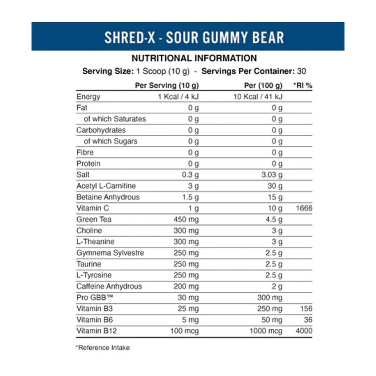 پودر چربی سوز شرد ایکس اکستریم اپلاید نوتریشن، دارای ترکیباتی مانند عصاره چای سبز است. نود و پنج درصد پلی فنول در این مکمل گزارش شده است. فلفل کاین، کافئین، عصاره برگ زیتون، کولین بی تارترات، عصاره فلفل سیاه، گروه ویتامین بی، گاما بوتیرو بتائین اتیل استر از جمله ترکیبات این مکمل ورزشی هستند. همچنین ویتامین ب شش و سیانو کوبالامین و ویتامین ب دوازده از دیگر ترکیبات این پودر لاغری می باشند. نحوه مصرف این مکمل به این گونه است که ورزشکار نیم ساعت قبل از تمرین می تواند یک اسکوپ- معادل ده گرم- از این پودر را مصرف نماید.