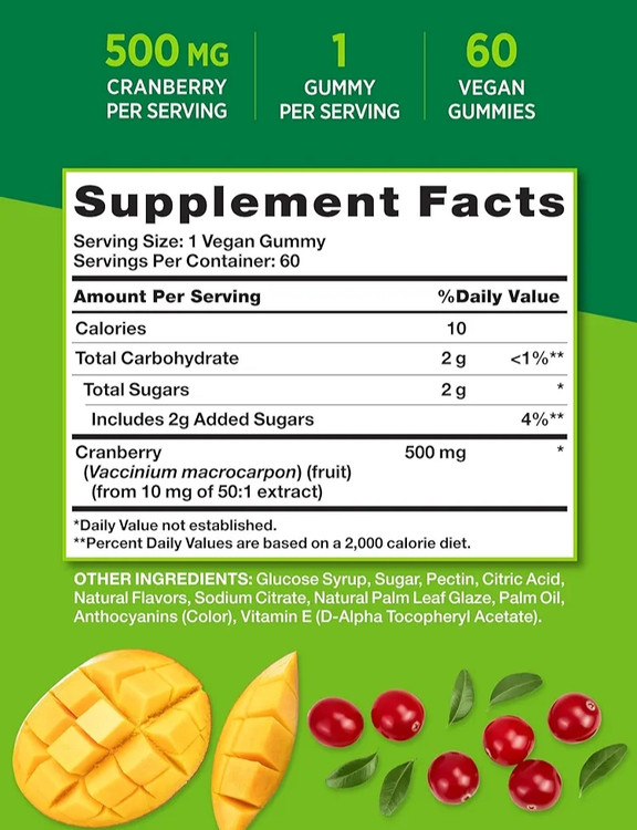 صمغ های کرن بری Nature's Truth® طعم شگفت انگیزی دارند که با طعم های طبیعی کرن بری و انبه ساخته شده است. هر صمغی که از خود میوه استخراج می شود، منبع باکیفیتی از کرن بری است و گیاهی و غیر GMO است. آدامس های پاک کننده کرن بری فاقد گلوتن، گندم، مخمر، شیر، لاکتوز و سویا هستند و بدون طعم دهنده های مصنوعی و شیرین کننده های مصنوعی ساخته می شوند.
