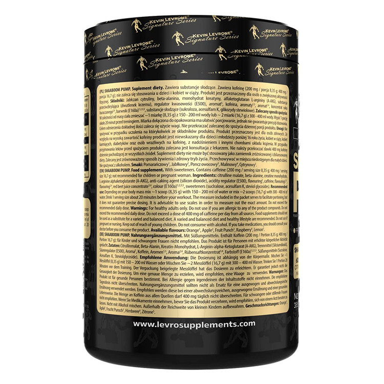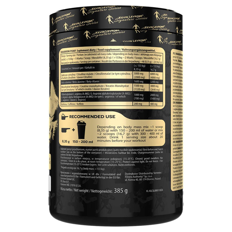 را بردارید ، به آب اضافه کنید ، مخلوط کنید و میل کنید و 15 الی 20 دقیقه بعد ، تاثیر آن را ببینید ! مکمل پمپ کوین لورون به جامعه ی بدنسازان شوک وارد کرده ! مکمل قبل از تمرین SHAABOOM کمپانی Kevin Levrone تمرکز شما را بر روی تمرینات افزایش می دهد و چنان قدرتی به عضلات شما می دهد که می توانید حتی رکوردهای تمرینی خود را بشکنید ! ما همیشه به ارتباط قوی بین ذهن و عضله توجه کرده ایم . وقتی به تمرکز ، انرژی ، قدرت و توانمندی دائم فیزیکی و قدرت تهاجمی مثبتی می رسید ، در مسیر موفقیت هستید و می توانید به اهداف فیزیکی خود دست یابید . مکمل شبوم کوین لورون بهترین مکمل انرژی قبل از تمرین است که شما با استفاده از آن می توانید با بالاترین حد انرژی ورزش کنید .ویژگی های پمپ SHAABOOM کوین لورون :هر وعده حاوی 3000 میلیگرم سیترولین مالات خالص ، 1500 میلی گرم کراتین ، 1600 میلیگرم بتاآلانین ، 1000 میلیگرم AAKG و 200 میلی گرم کافئین آلی ( معادل 2 فنجان قهوه ) حاوی آمینو اسیدهای زنجیره ای شاخه ای برای حمایت از سنتز پروتئین تقویت کننده ی عضلات افزایش انرژی ، تمرکز و رشد فاقد هر نوع عطر و رنگ مصنوعینحوه ی مصرف مکمل پمپ شبوم بلک کوین لورون :یک پیمانه (8/35 گرم ) از پمپ شبوم را با 16 تا 20 اونس ( 2 تا 2.5 فنجان ) آب سرد مخلوط کنید و 30 الی 45 دقیقه قبل از تمرین میل کنید . هشدار محصول : با سایر مواد کافئین دار مصرف نکنید . اگر به کافئین حساسیت دارید ، به دلیل وجود مقدار قابل توجهی کافئین در این محصول ، ممکن است دچار عصبانیت ، تحریک پذیری ، بی خوابی شدید و تپش قلب شوید . خانم های باردار و شیرده ، خانم هایی که قصد باردار شدن دارند و افراد زیر 18 سال و افراد دارای شرایط خاص پزشکی ، قبل از مصرف حتما با پزشک مشورت کنند . اگر پس از مصرف ، متوجه هرگونه علائم نامطلوب شدید ، فورا مصرف را قطع و به پزشک مراجعه کنید . دور از گرمای شدید و در جای خشک و خنک نگهداری شود . دور از دسترس کودکان نگهداری شود